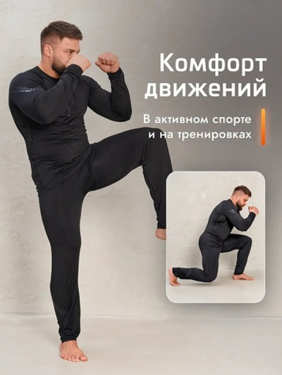 Анатомический крой комплекта разработан с учетом особенностей мужской фигуры.Материалы эластичны, не сковывают движения, отлично прилегают к телу и не образуют складок. Вы сможете заниматься спортом, работать или просто отдыхать, не ощущая никакого дискомфорта.