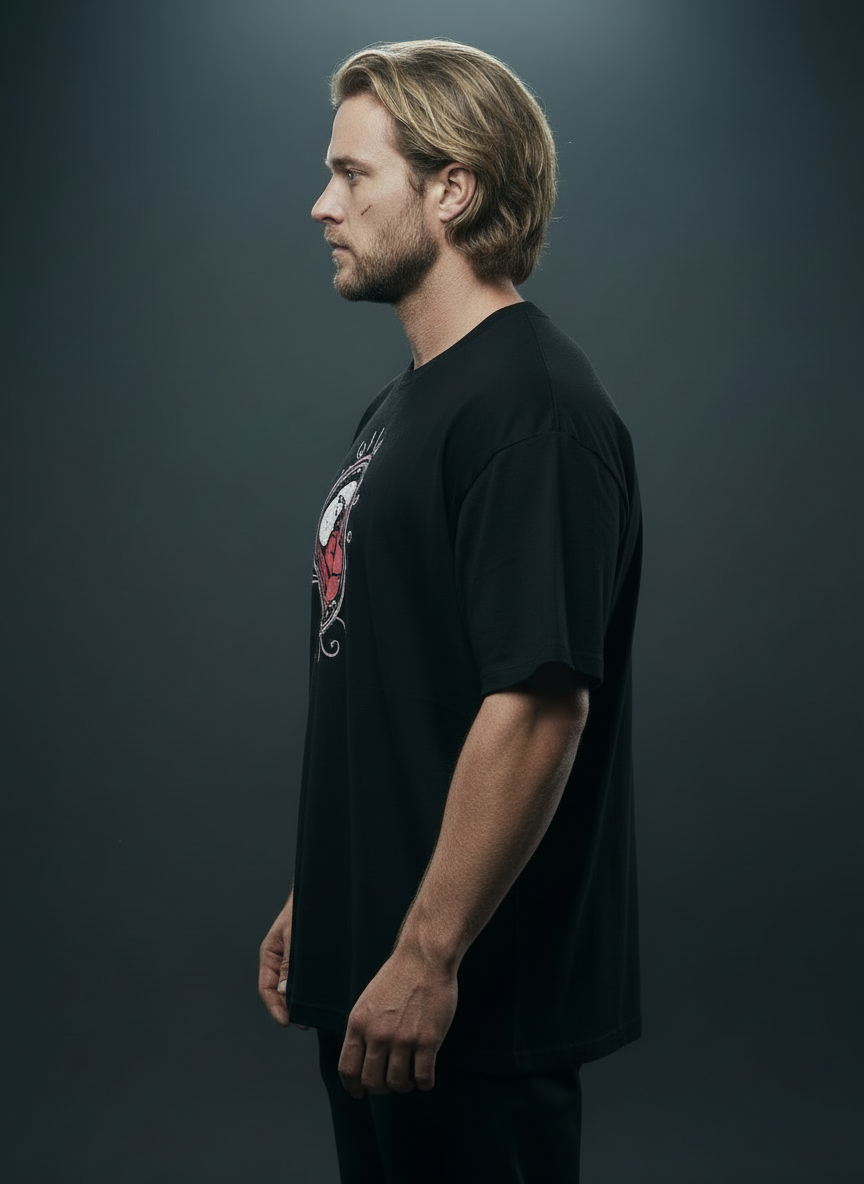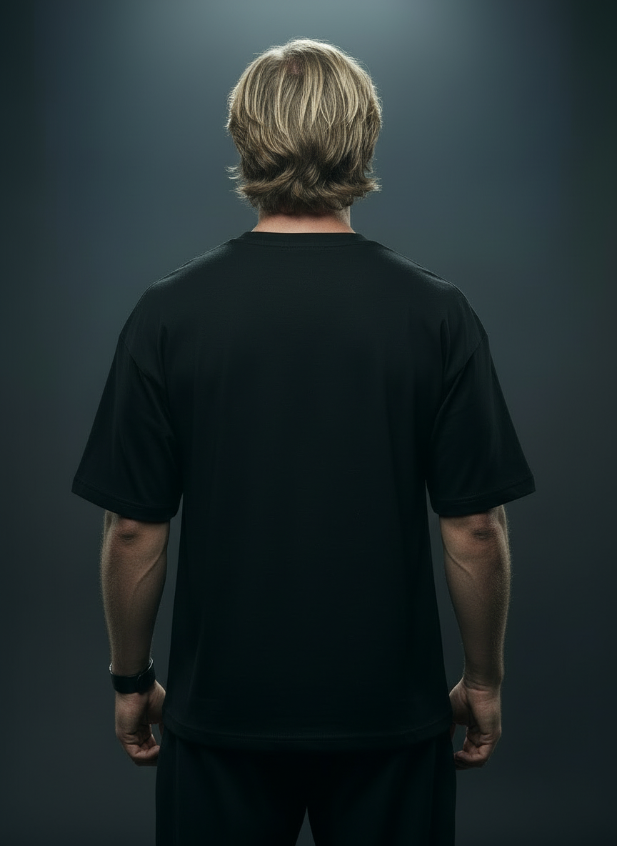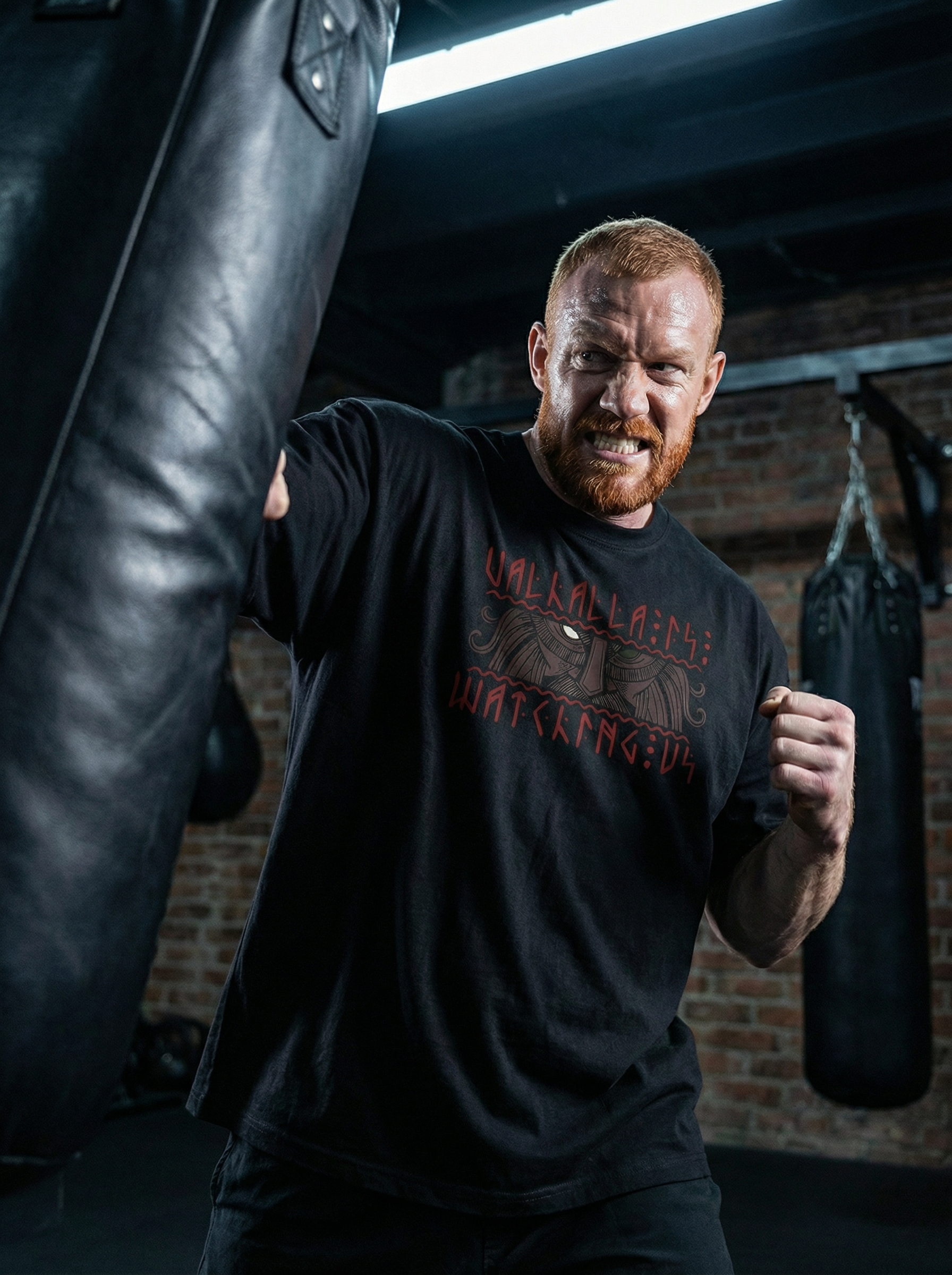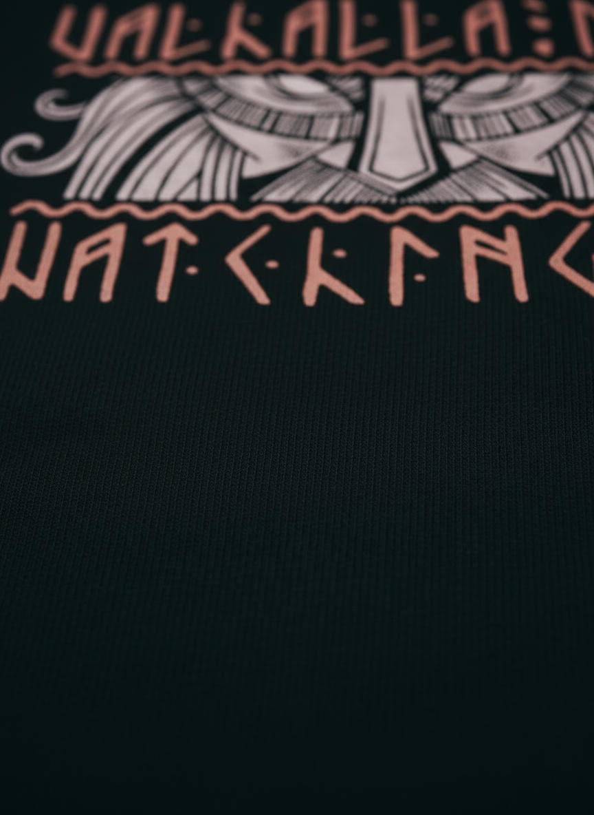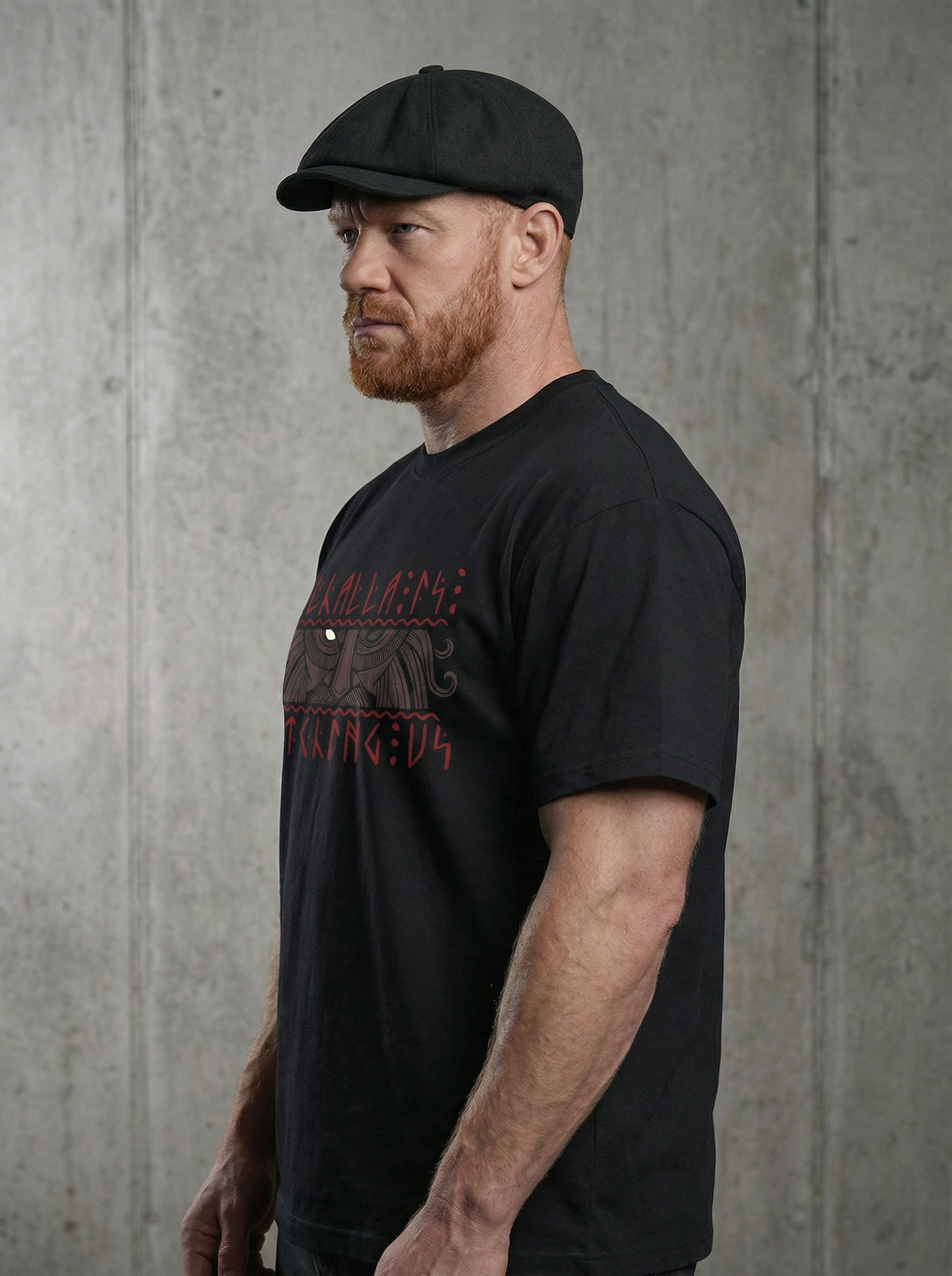 На груди — мощный графический образ, вдохновлённый скандинавской эстетикой и духом северных дружин.