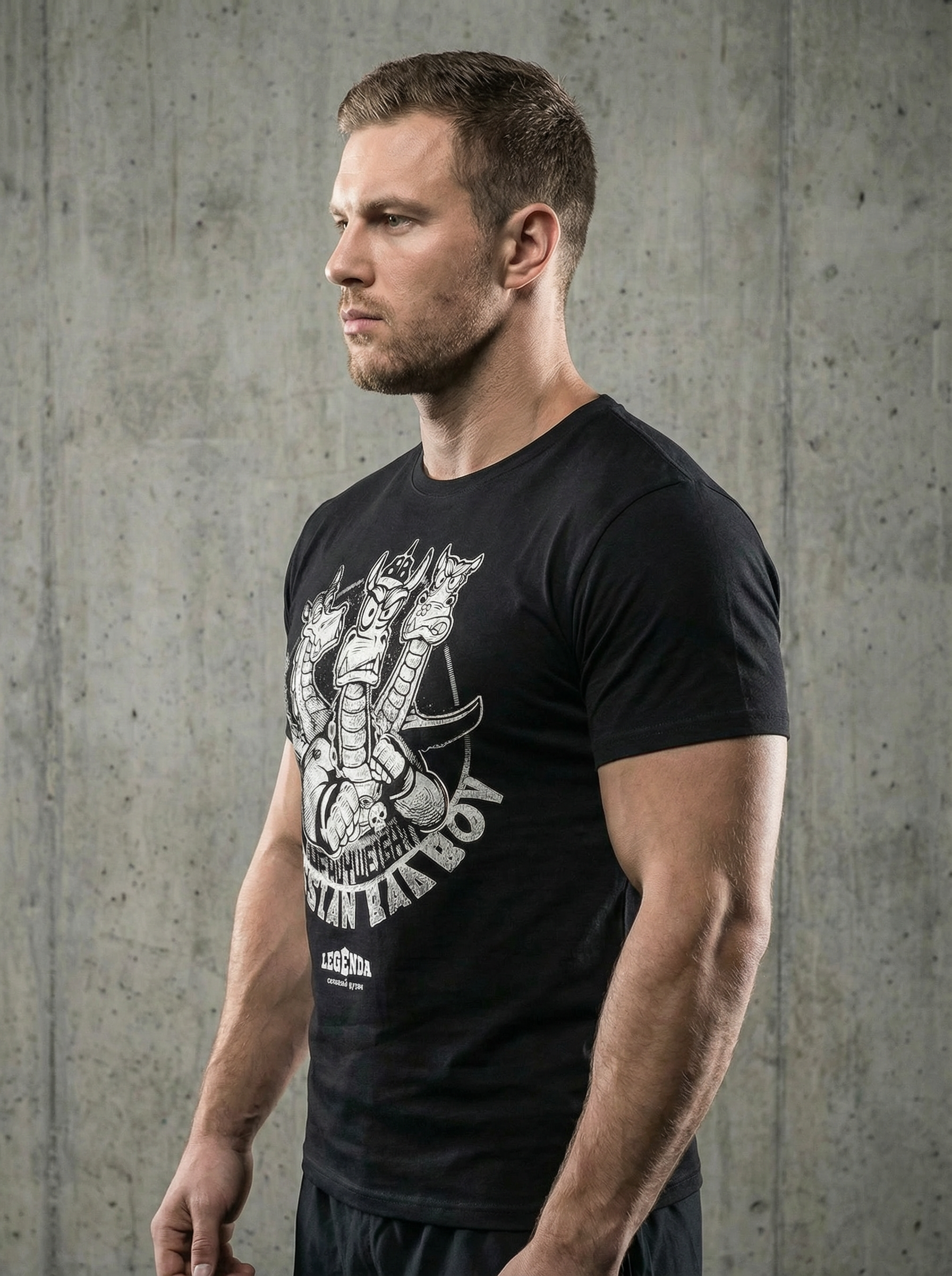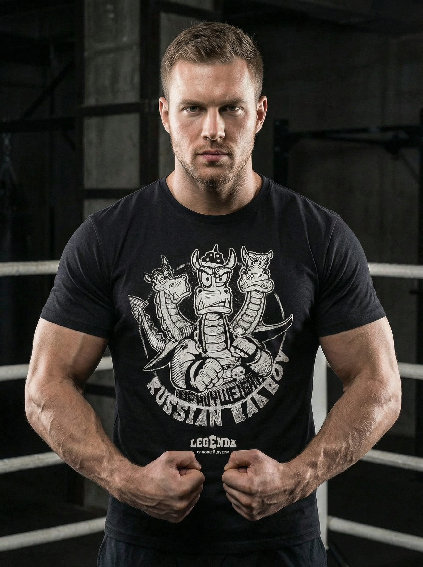 На груди — трёхглавый Змей Горыныч, но в современном стиле: не сказочный персонаж, а хулиган с характером, силой и боевым настроем.