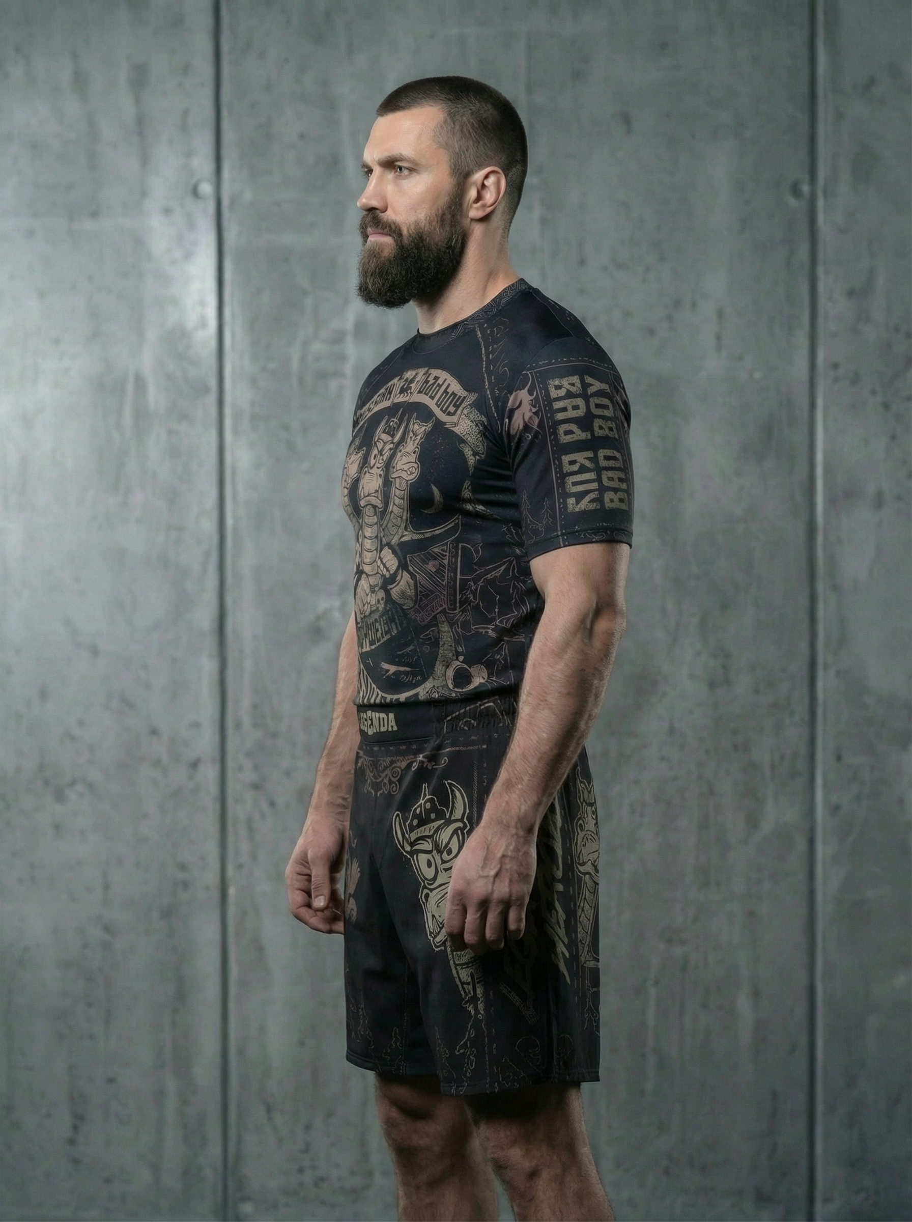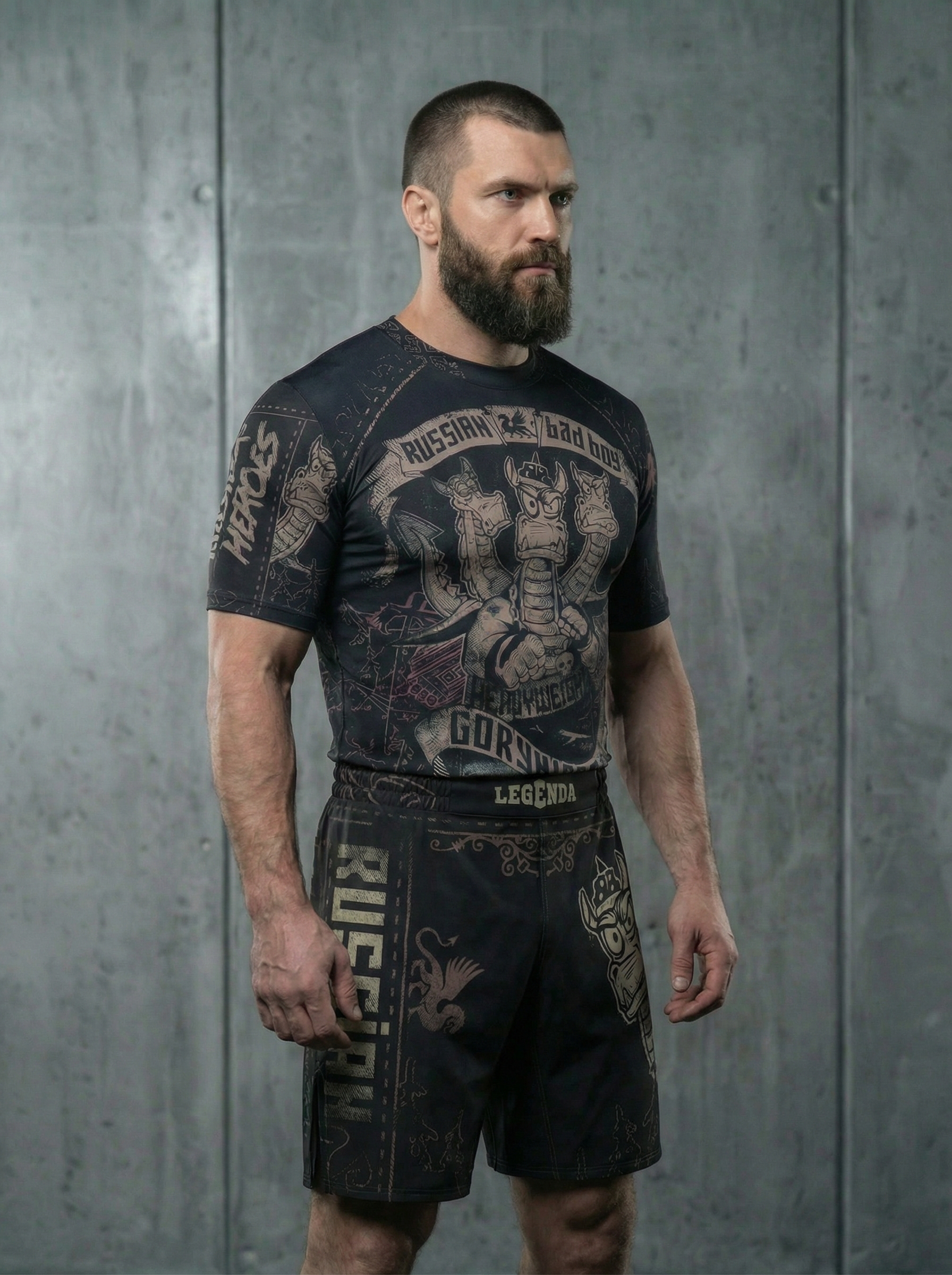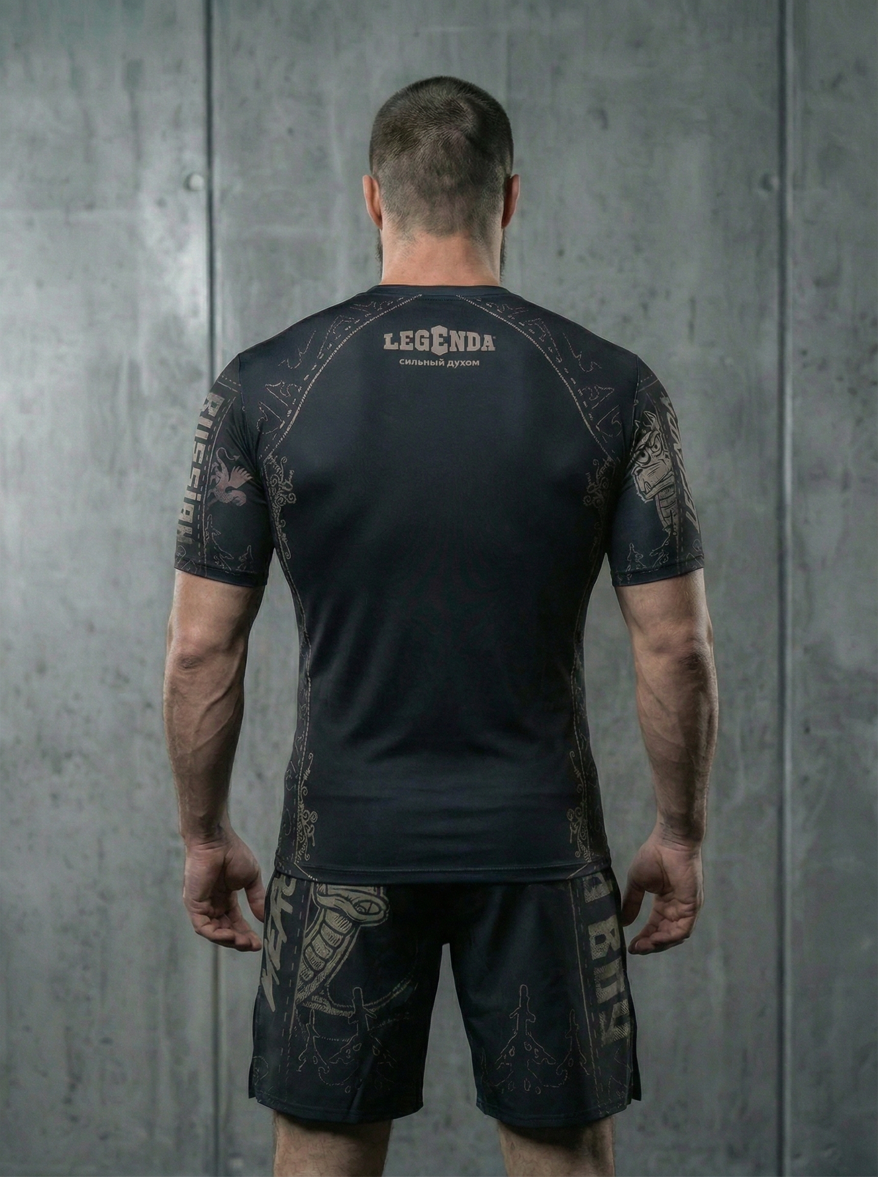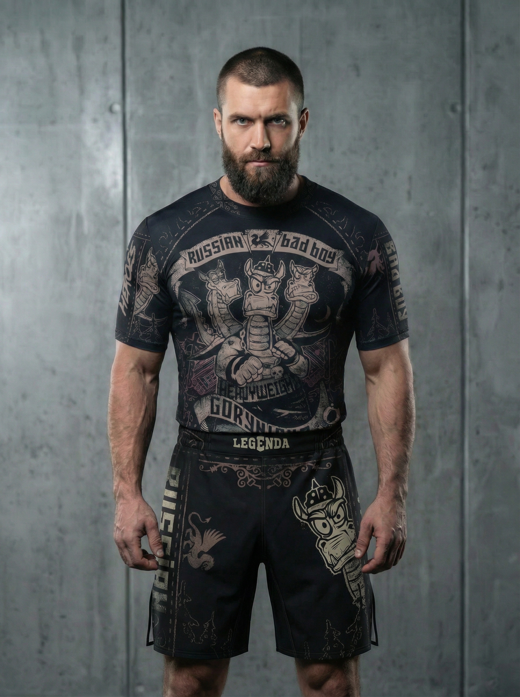 В комплект входит Шорты спортивные тренировочные LEGENDA Горыныч и Рашгард с коротким рукавом LEGENDA Горыныч черный.
