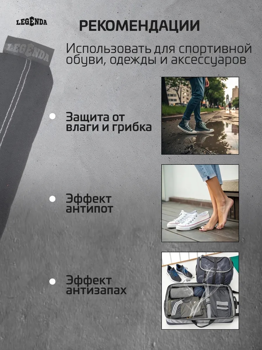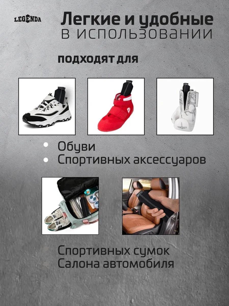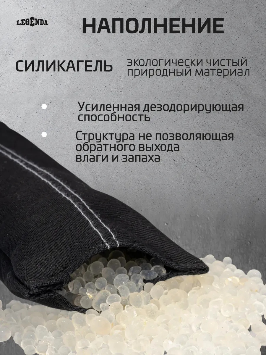 При использовании поглотителя запахов и влаги Legenda для спортивной экипировки (Драйпер) не деформируется кожа обуви и перчаток. Легкость и удобство в использовании. Усиленная дезодорирующая способность. При использовании поглотителя, перчатки и обувь становятся сухими, сохраняются дольше. Можно использовать Драйпер для просушки и дезодорирования.