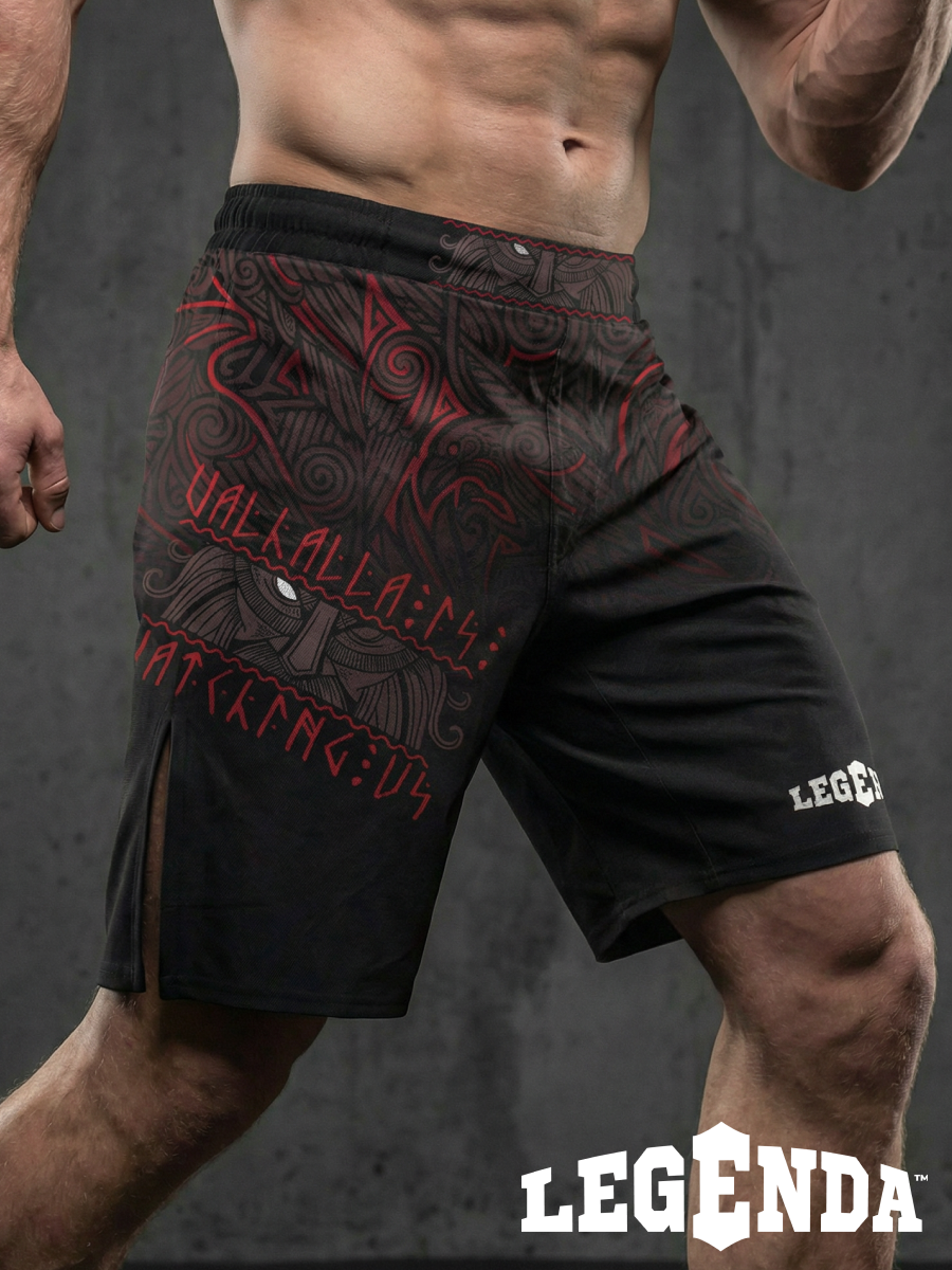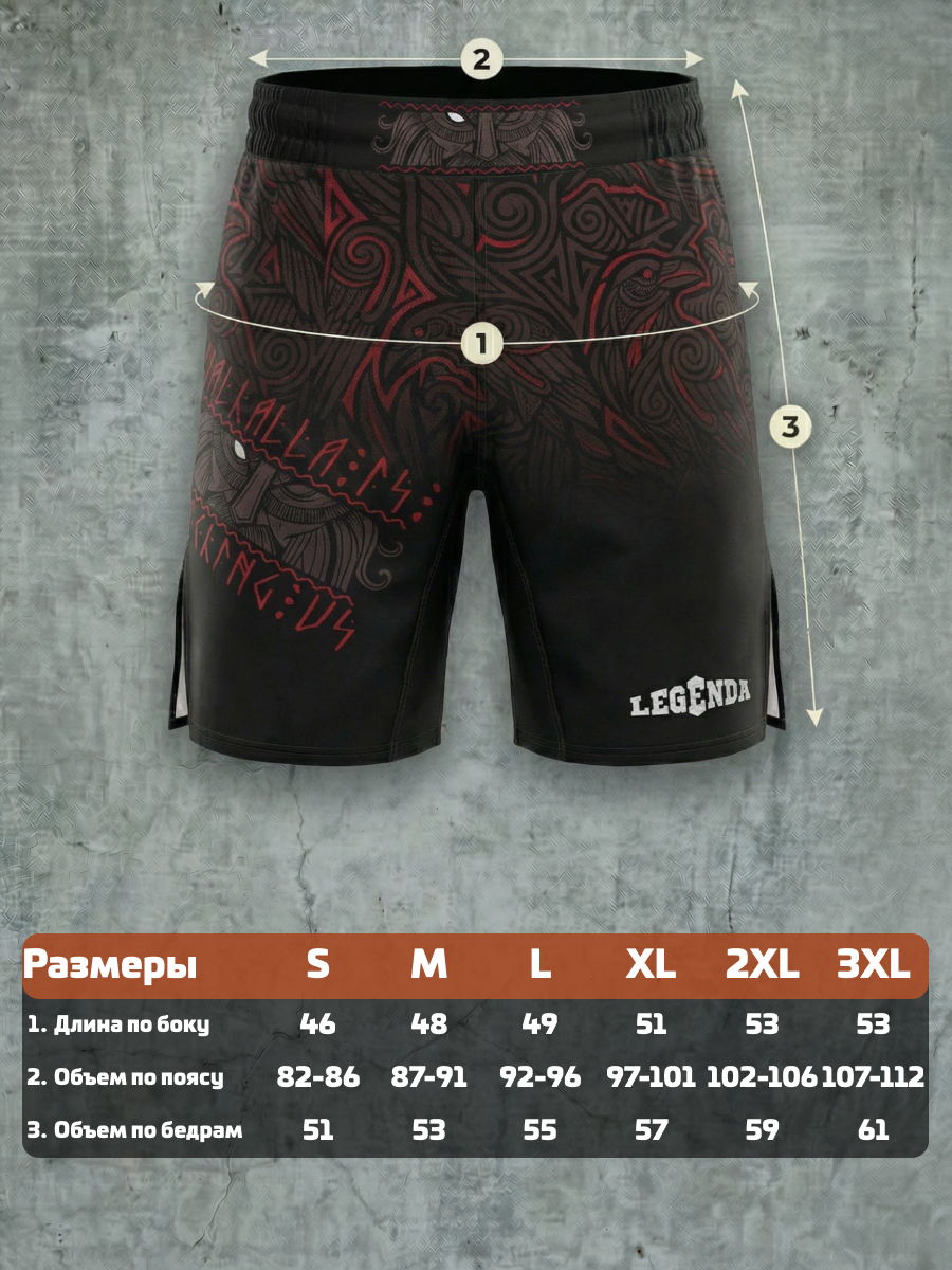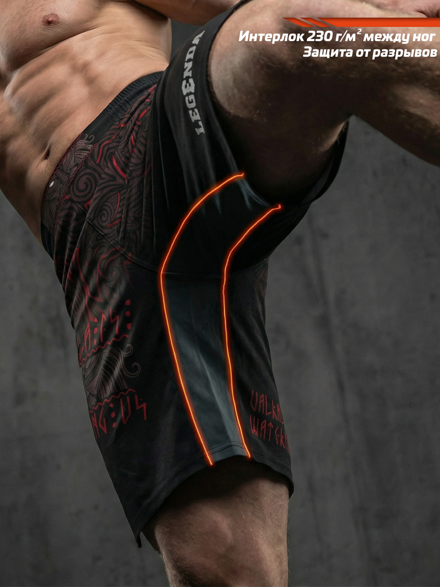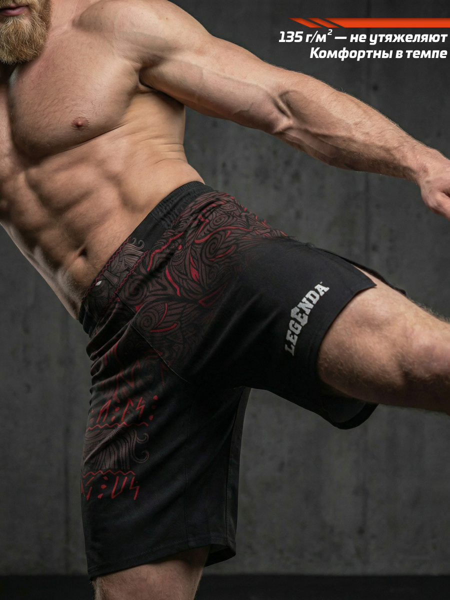 Шорты спортивные тренировочные LEGENDA “Valhalla Watching Us” — дань силе варягов, мореплавателей и воинов, которые несли честь и стойкость сквозь бурные воды и битвы.