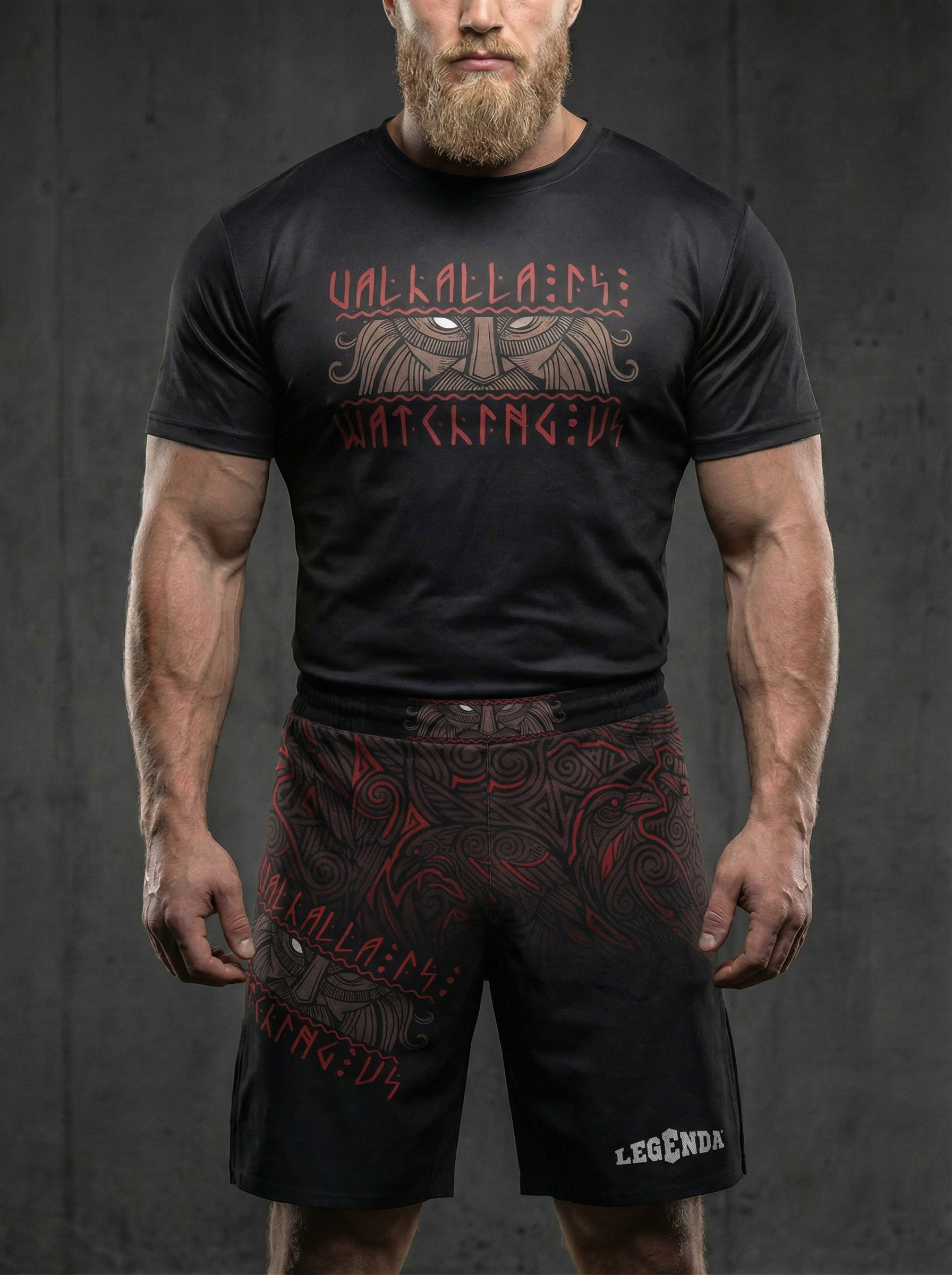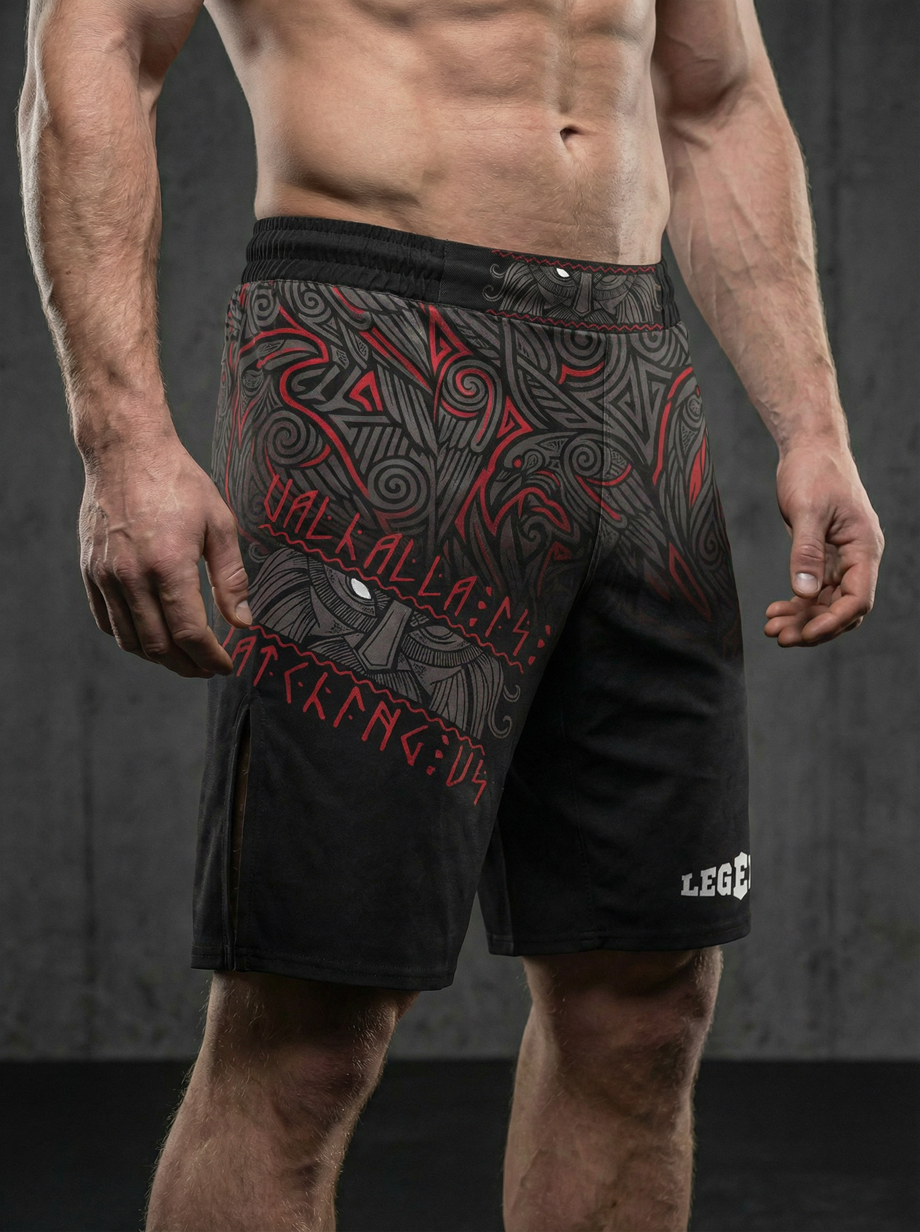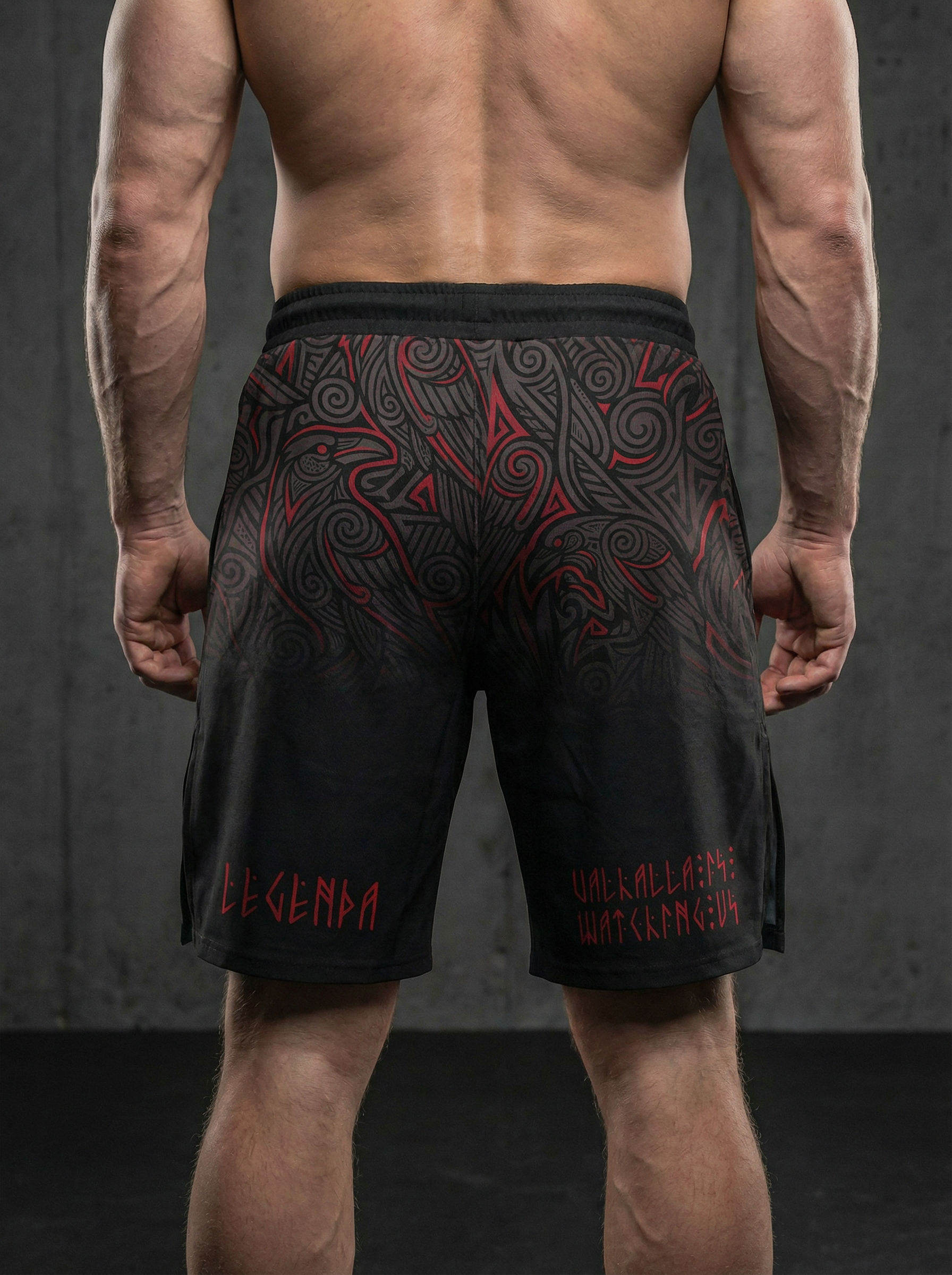 Шорты спортивные тренировочные LEGENDA “Valhalla Watching Us” — дань силе варягов, мореплавателей и воинов, которые несли честь и стойкость сквозь бурные воды и битвы.
