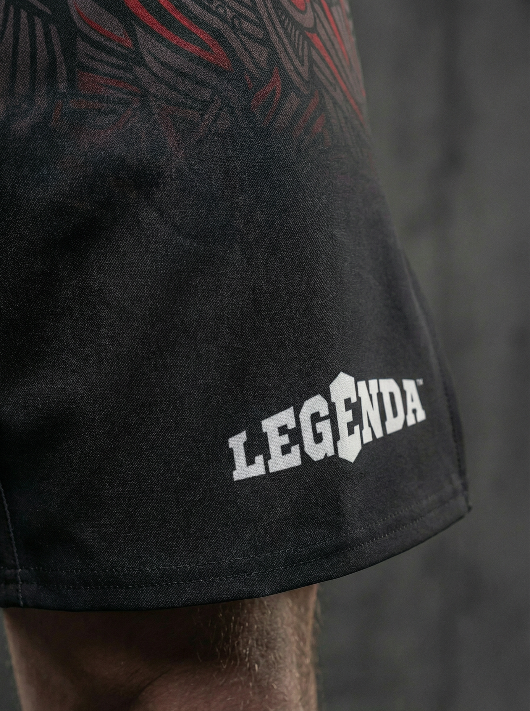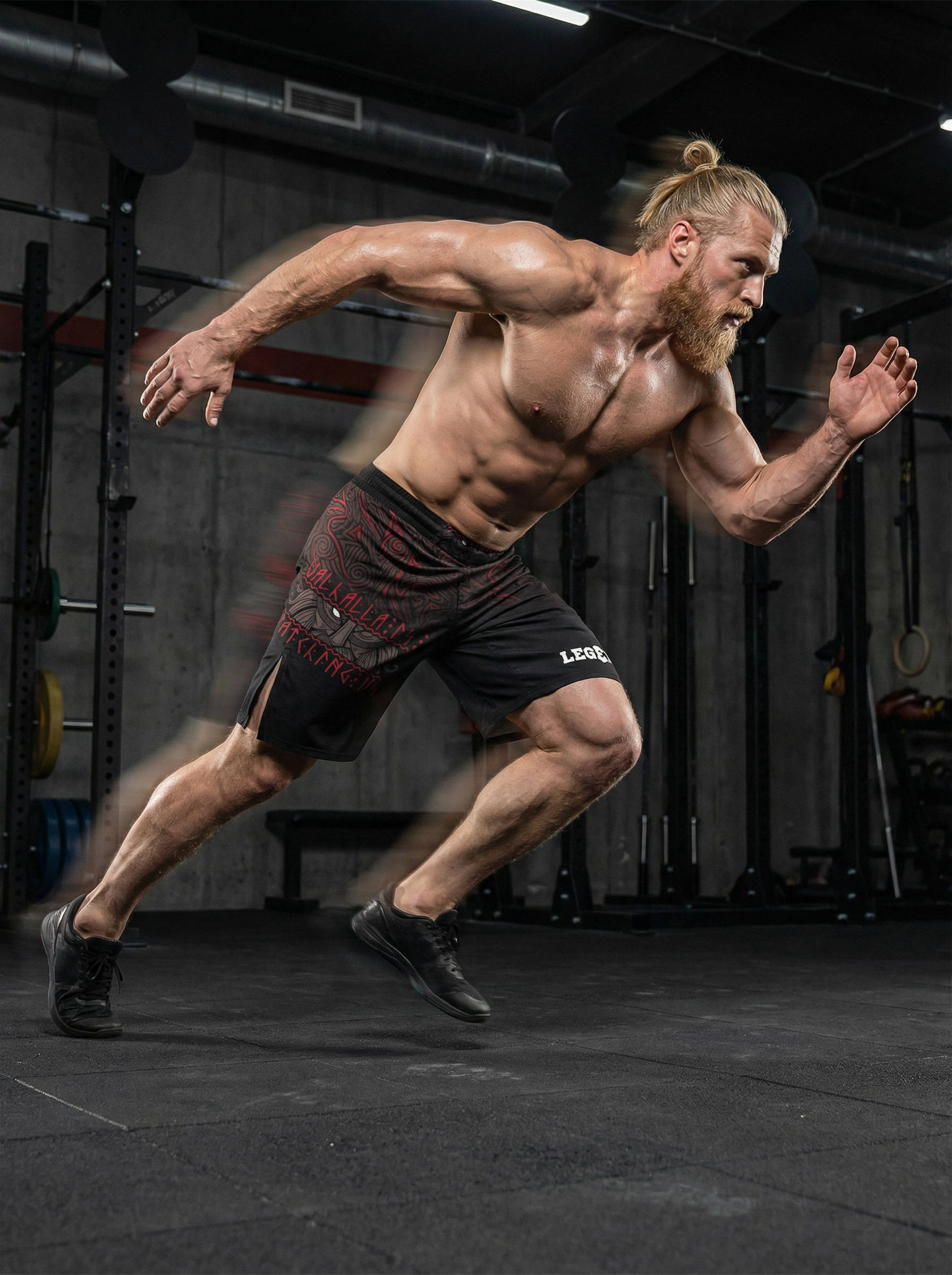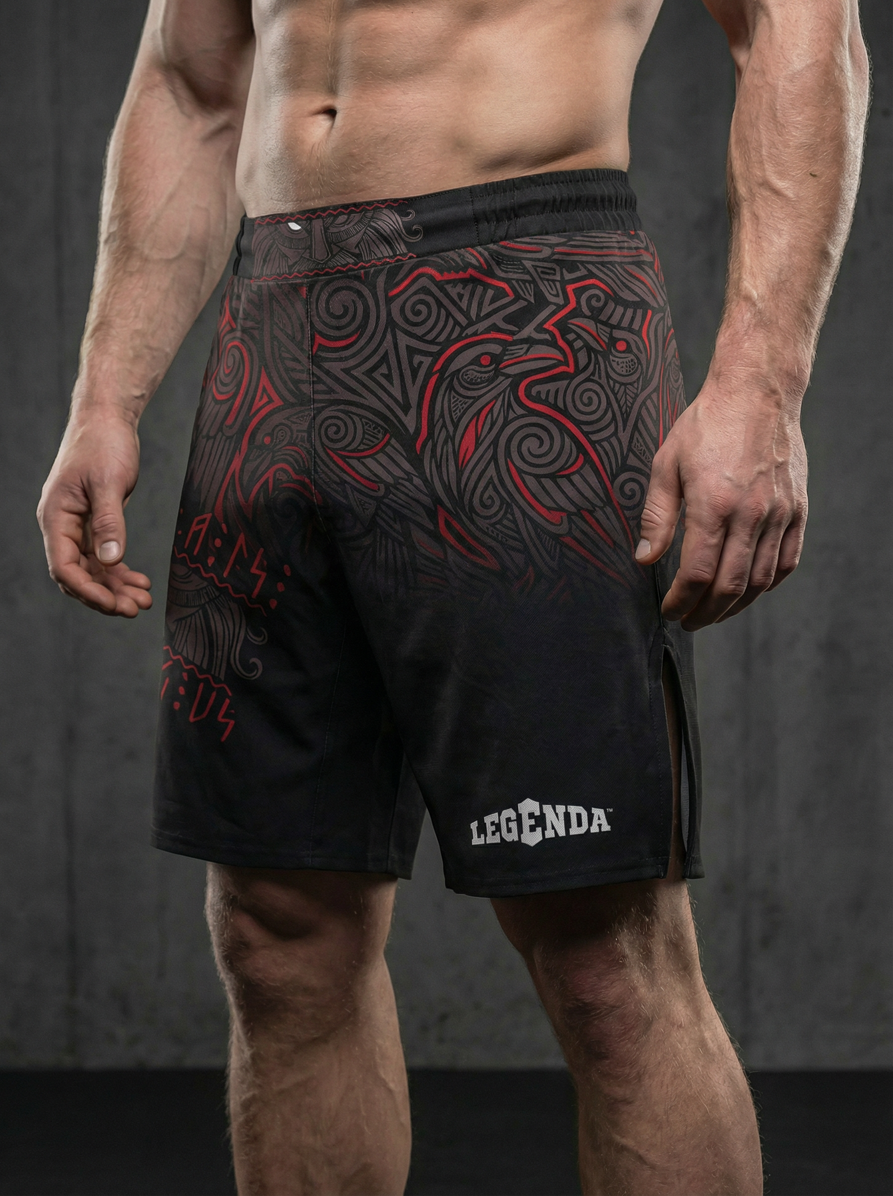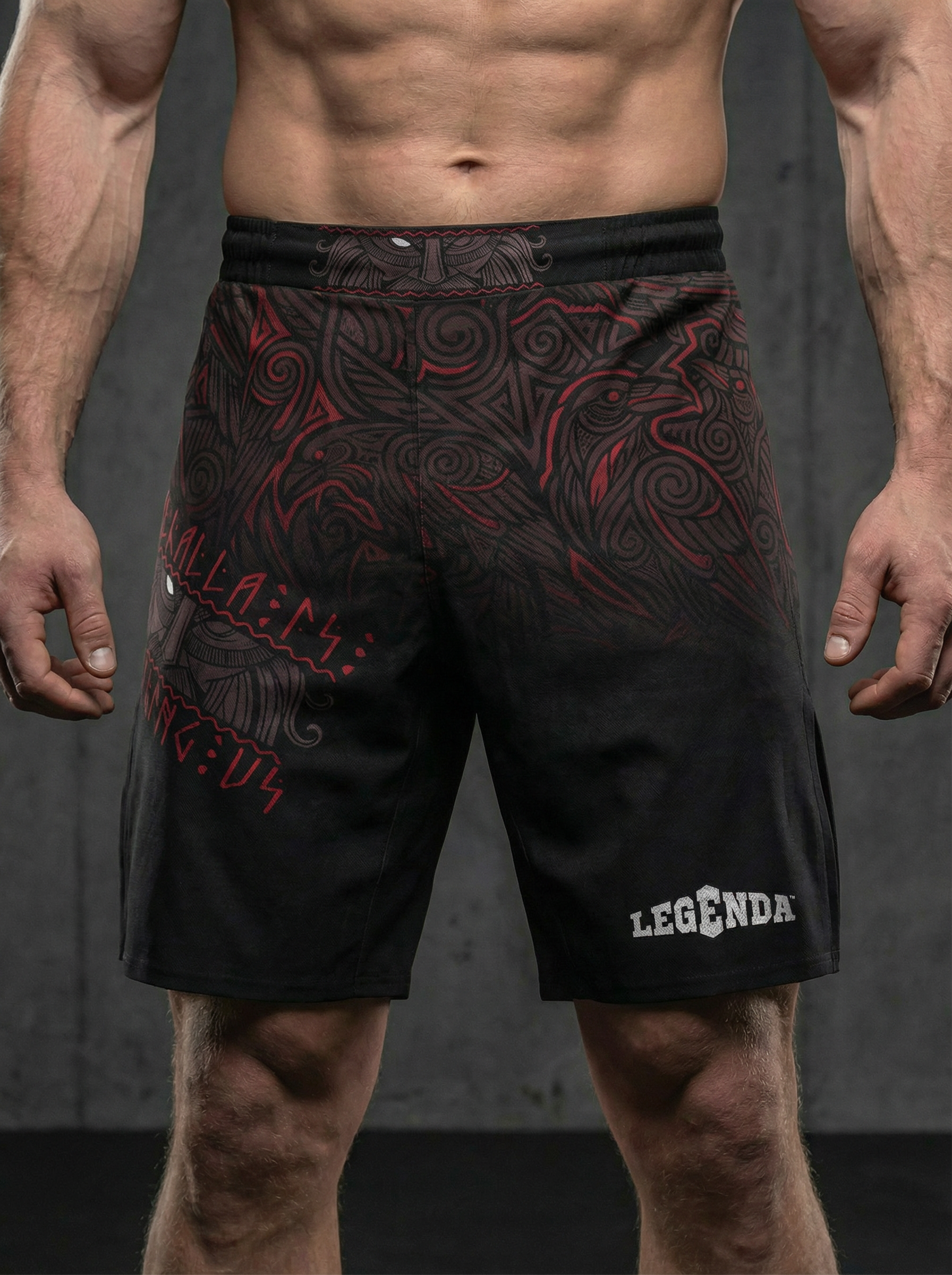 Шорты спортивные тренировочные LEGENDA “Valhalla Watching Us” — дань силе варягов, мореплавателей и воинов, которые несли честь и стойкость сквозь бурные воды и битвы.
