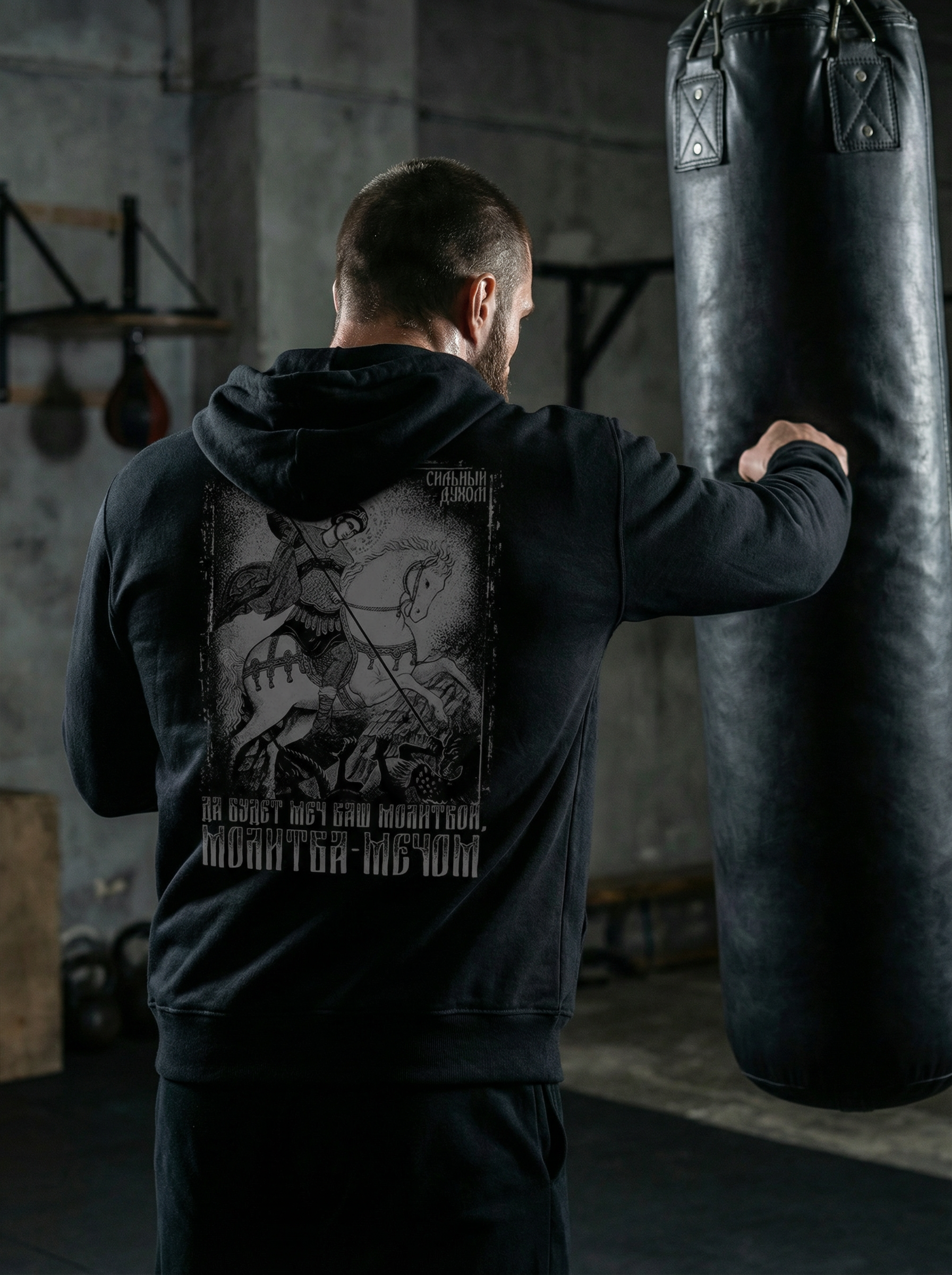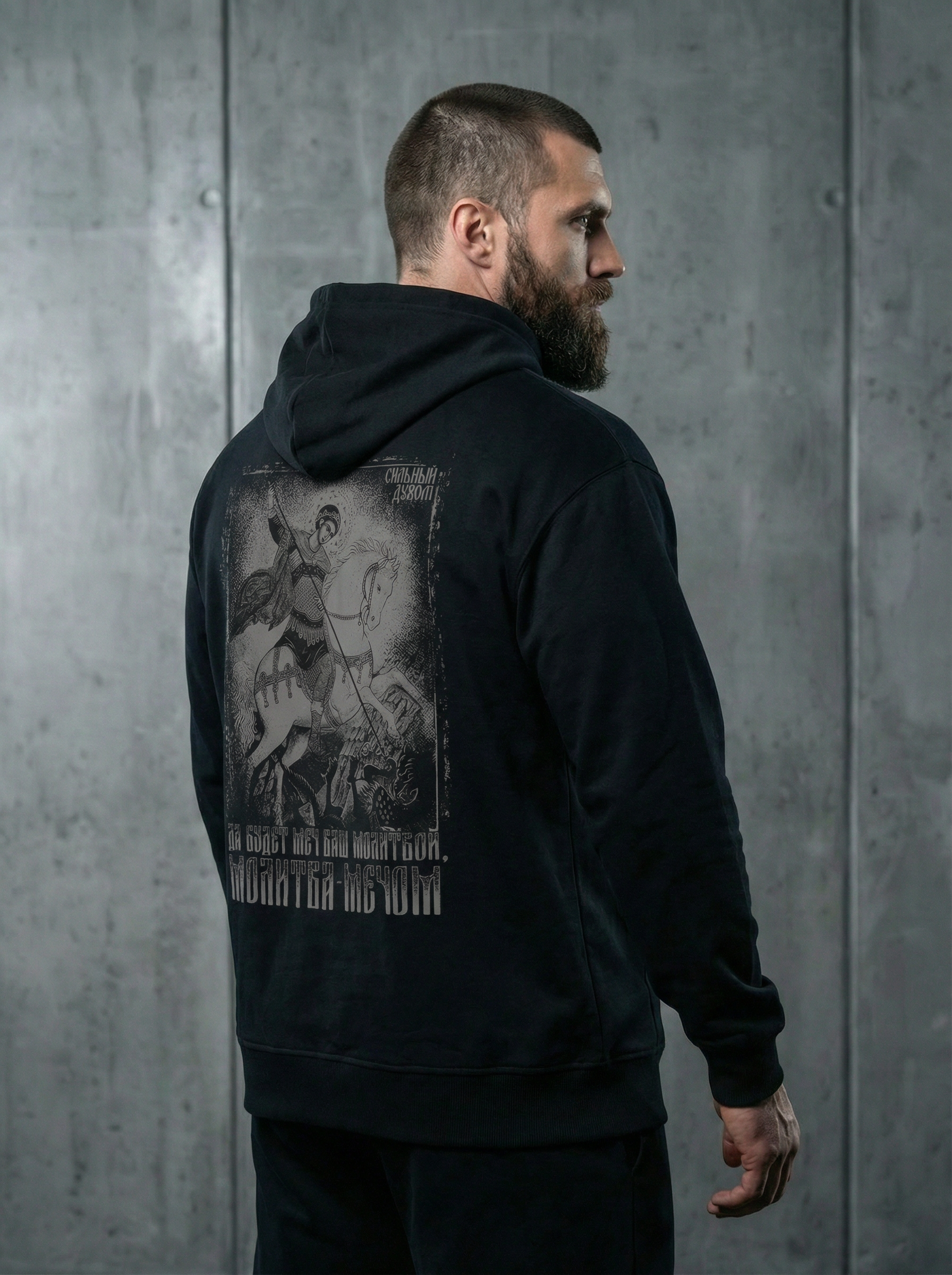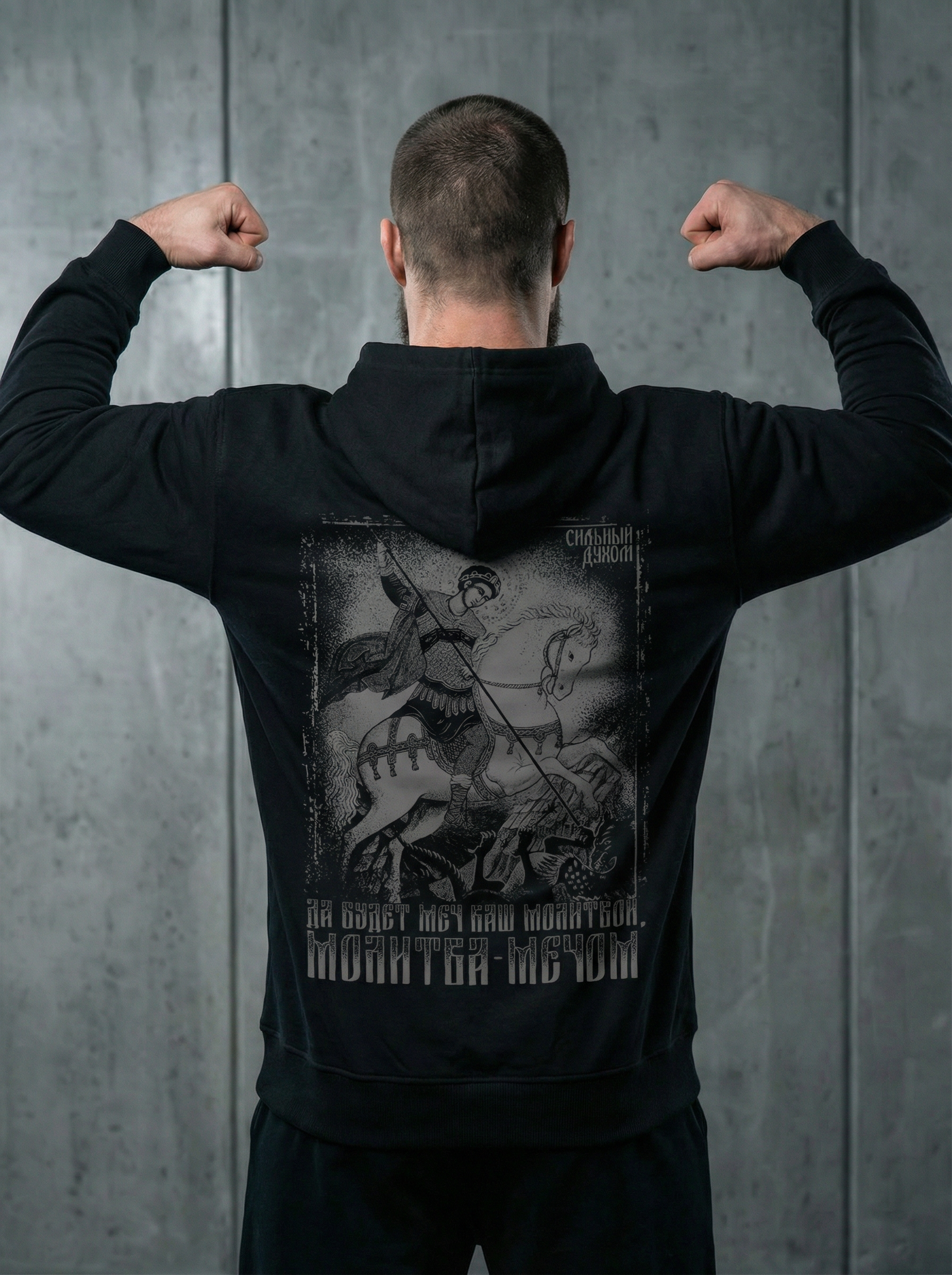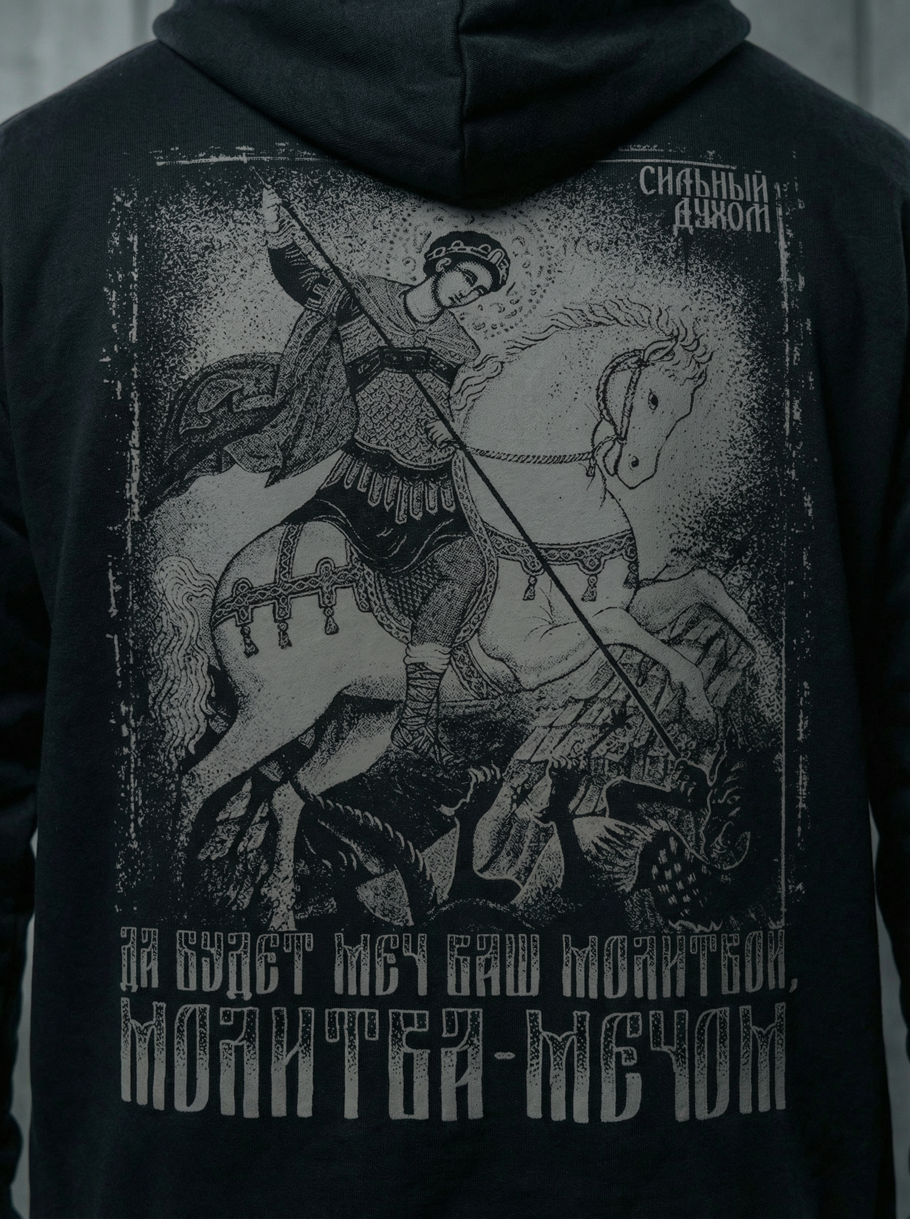 Принт выполнен в патриотическом и православном стиле. Образ святого воина — символ победы, веры и силы, отражающий дух предков и характер русича. Это визуальный код защитника, воина, как образа «щит России».